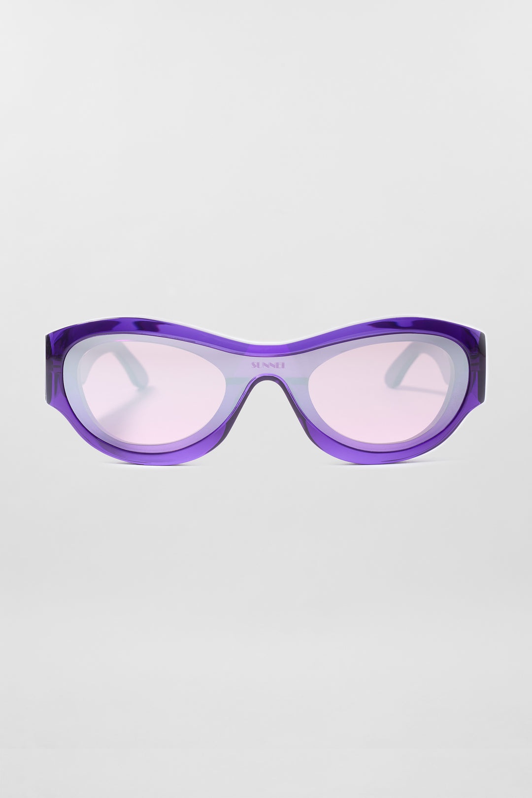 SUNNEI sunglasses featuring rounded lines and a single rounded-shape lens. Dark purple acetate and transparent lens with lasered logo on front. Width:14 cm Height: 4.5 cm Temples lenght: 14.5 cm 100% ACETATE / 100% NYLON Materials from Italy Made in Italy