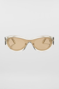 SUNNEI sunglasses featuring rounded lines and a single rounded-shape lens. Green see through acetate and slightly mirrored dark yellow mask lens with lasered logo on front. Width: 14 cm Height: 4.5 cm Temples lenght: 14.5 cm 100% ACETATE / 100% NY Materials from Italy Made in Italy