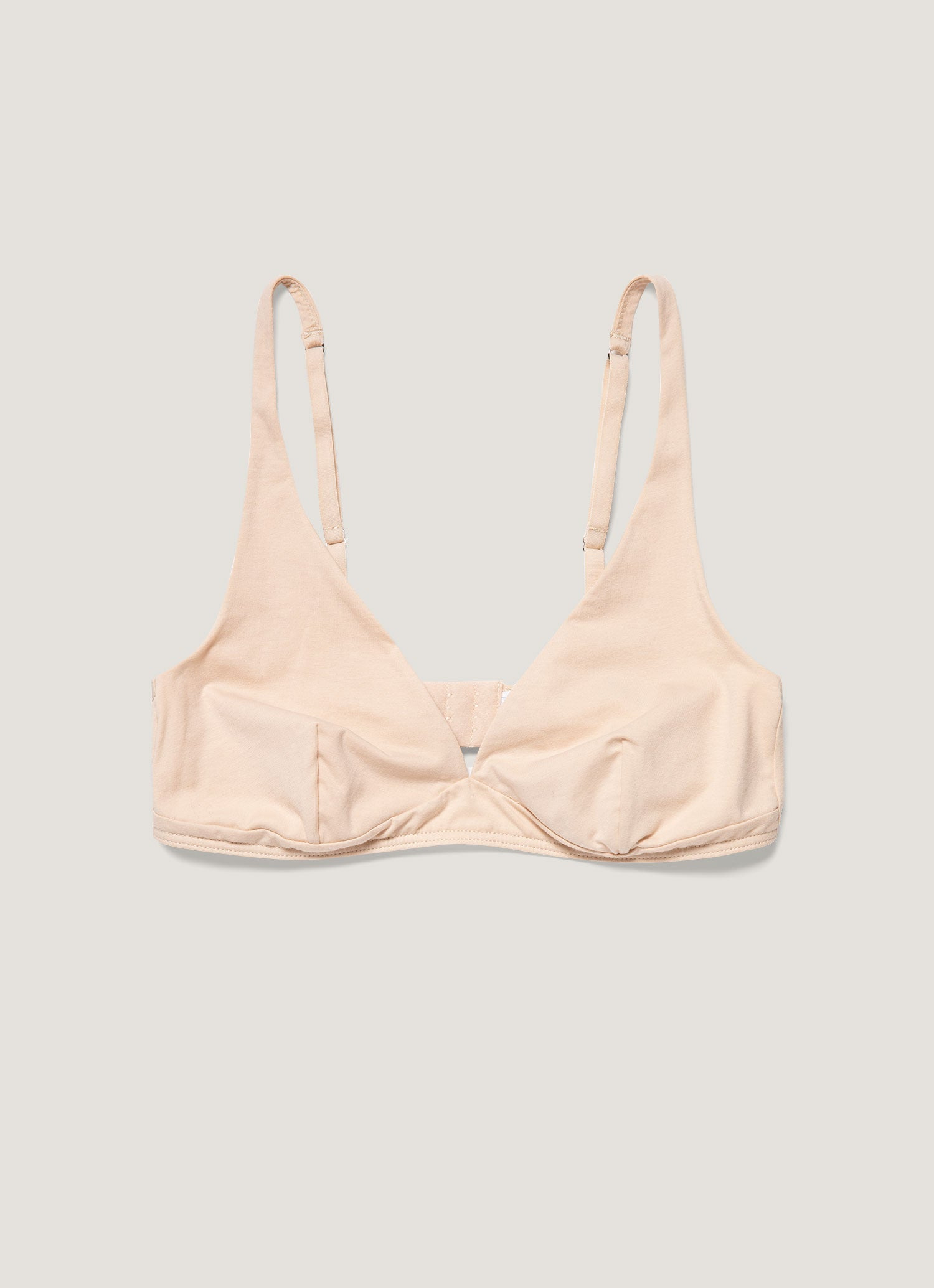 Free from padding or underwire, a soft cup bra designed for a comfortable barely-there feel. Triangle cups with bust darts and a soft elastic under band provide support, while adjustable hook fastening and fully adjustable straps allow for a perfect fit. Cut from a premium stretch-cotton for ultimate comfort. Complete the set with our matching bikini briefs. Product Code: WBRA4016-WHBE1 Fabric & Care - 92% Cotton, 8% Elastane - Gentle wash at 40°C - Do not tumble dry - Dry cleanable - Made in Portugal Size & Fit - Adjustable staps with clasp at back - No underwires - No padding - Model is 5'9" and wears a size S