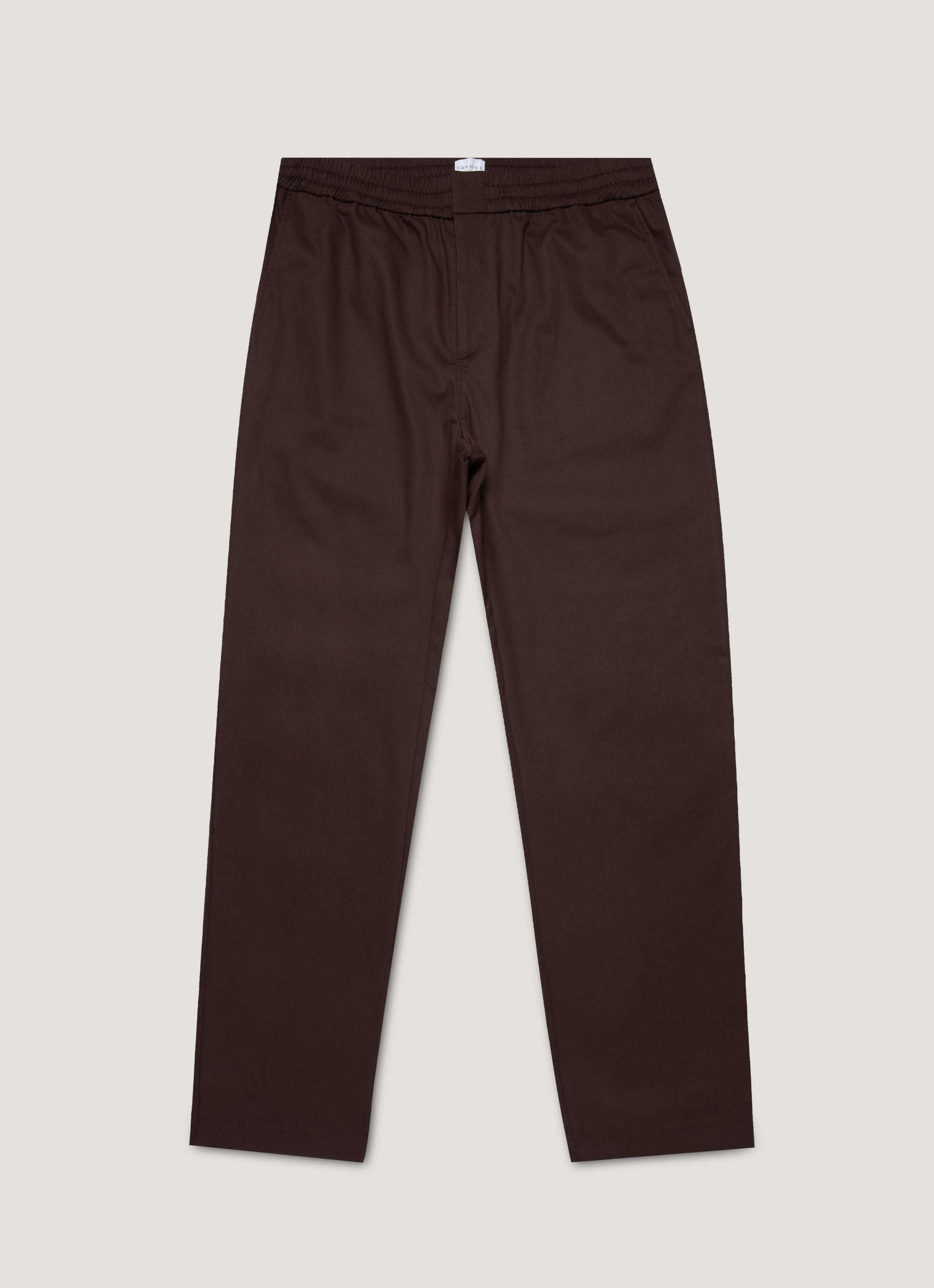 A luxurious trouser crafted from a blend of long-staple cotton and cashmere, perfected by an Italian mill with over a century of expertise. The cotton offers a smooth, refined feel, while the cashmere adds warmth and softness for exceptional comfort. Designed with a straight leg, slanted side pockets, and a drawstring waistband. Pair with the matching cotton cashmere overshirt for a relaxed yet elevated look. Product Code: MTRS3119-BRGD Fabric & Care - 95% Cotton, 3% Cashmere, 2% Elastane - Do not tumble dry - Dry clean only - Made in Portugal Size & Fit - Regular fit - Straight leg - Drawstring waist - Model is 6'3" and wears a size M