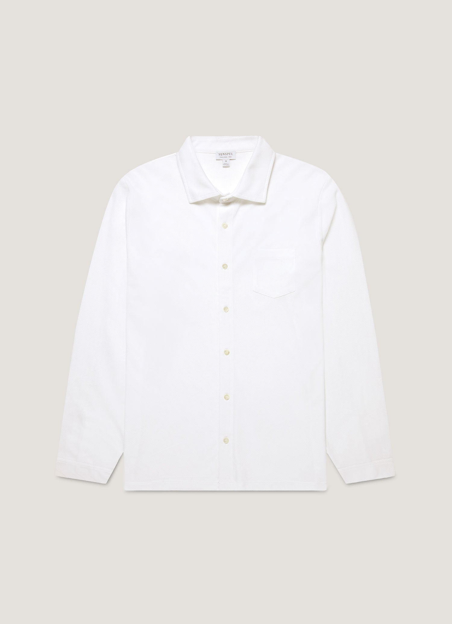 A long-sleeved shirt made from the same fabric as our iconic Riviera Polo Shirt. Crafted from the finest extra-long staple Supima cotton, traceable to its Californian farm of origin. Lightweight, breathable and exceptionally comfortable, the unique mesh fabric and style were originally developed by Sunspel in the 1950s for the French Riviera, and later tailored for Daniel Craig’s debut as James Bond in Casino Royale. Cut to the same slim fit as the original, this version features a taller collar, collar stands and cuffs for a more refined finish. Product Code: MSHT2121-WHAA Fabric & Care - 100% Supima Cotton - Cotton is fully traceable and sustainably sourced from California - Cotton is extra-long staple for durability and comfort - Shell buttons - Gentle wash at 30°C with similar colours - Do not tumble dry - Dry cleanable - Made in Portugal Size & Fit - Regular fit - Model is 6'3", chest 36" and wears a size M