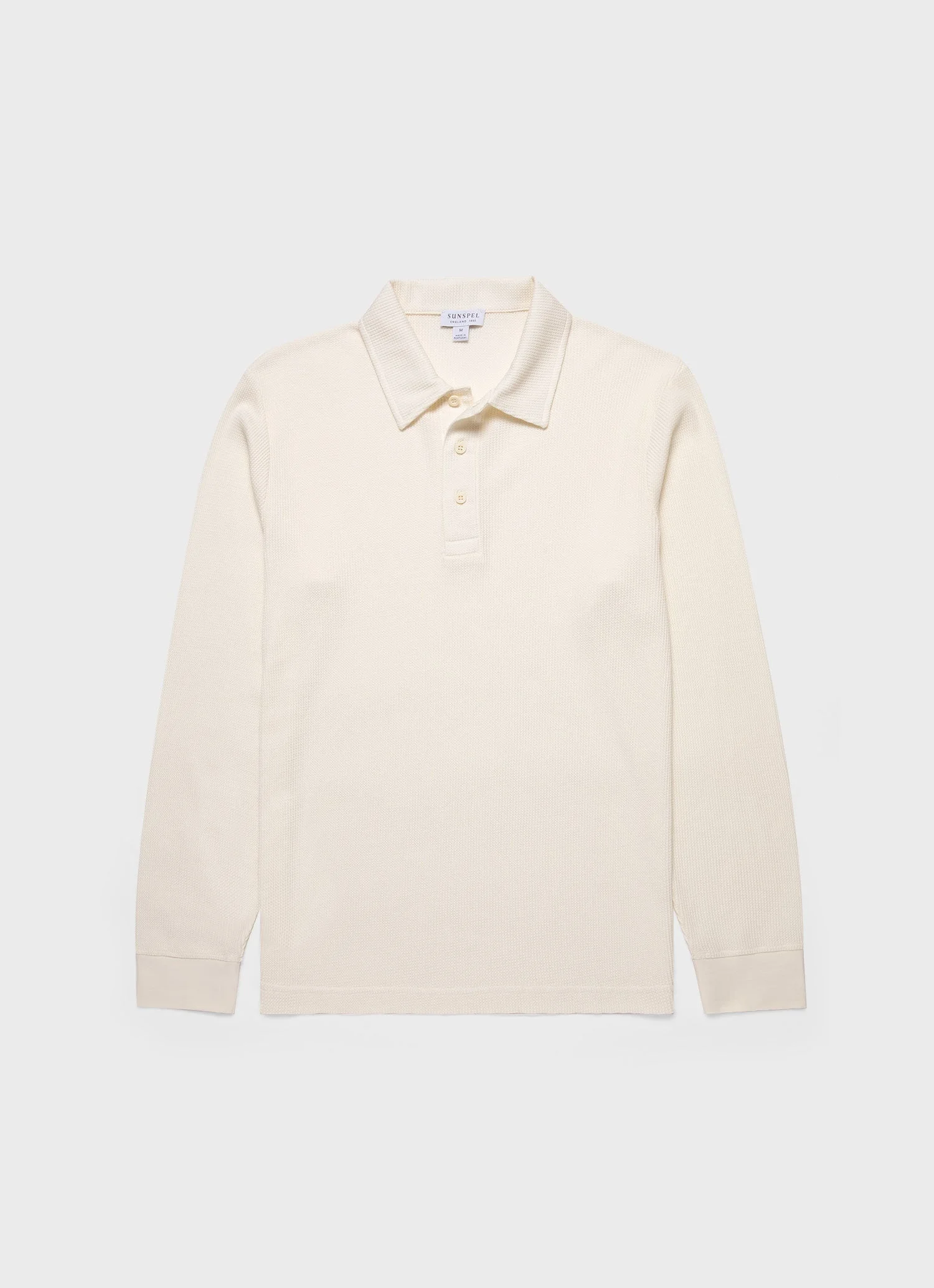 A long sleeve polo, made with a cotton waffle fabric specially developed for a soft handle. Crafted from a fully traceable extra-long staple Supima cotton for a smooth finish and extra durability. Features a one piece collar with a wide placket, and a ribbed hem and cuff. Product Code: MPOL1067-WHCR Fabric & Care - 100% Supima Cotton - Gentle wash at 30°C with similar colours - Do not tumble dry - Do not dry clean - Made in Portugal Size & Fit - Regular fit - Model is 6'2", chest 38" and wears a size M