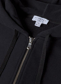Part of our matching track set, the Loopback Hoodie has a classic fit, rib cuffs and zip closure. The 'loopback' fabric was originally developed for sports garments, wicking moisture from the body. Today we use it to trap warm air inside, providing an insulating layer. Product Code: MHOD1517-BKAA Fabric & Care - Main: 100% Cotton - Ribs: 95% Cotton, 5% Elastane - Gentle wash at 30°C - Do not tumble dry - Do not dry clean - Made in Portugal Size & Fit - Regular fit - Model is 6'2", chest 38" and wears a size M
