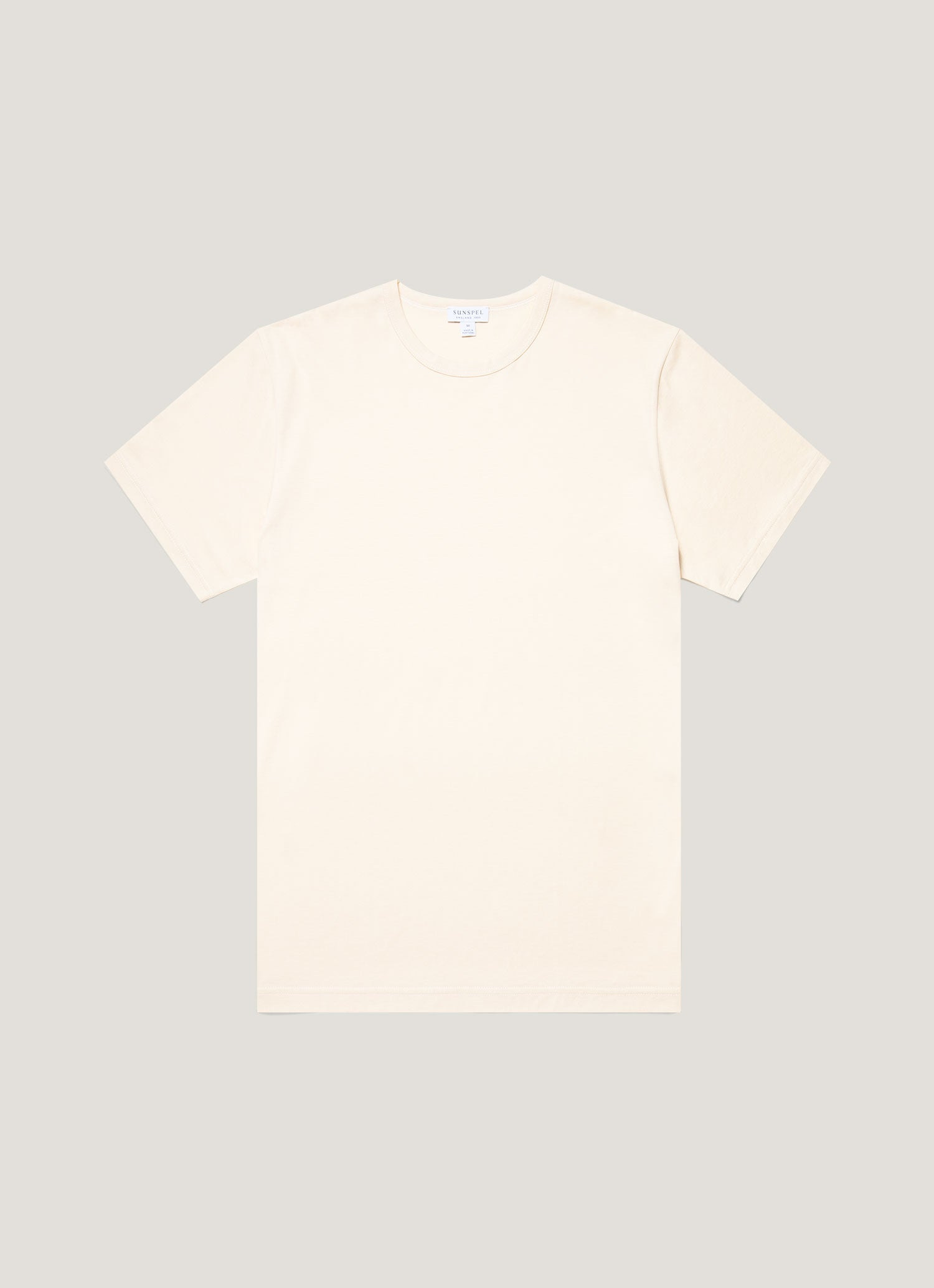 We made one of the world’s first T-shirts and have been perfecting it for over 100 years. Our Classic T-shirt is handmade in the Sunspel factory in Long Eaton, England, using the finest, extra-long staple Supima cotton that can be traced to its Californian farm of origin. The fabric - a unique Sunspel development - is lightweight, durable and exceptionally smooth against the skin. With a slim fit, it is essential to every wardrobe. We believe it is the perfect T-shirt, now in an undyed pure cotton showing the ecru colour of the natural fibre. Product Code: MTSH0001U-NUAB Fabric & Care - Made in England - 100% Supima Cotton - Cotton is fully traceable and sustainably sourced from a single farm in California - Cotton is extra-long staple and 2 fold for durability and comfort - Fabric is undyed - Gentle wash at 30°C - Do not tumble dry - Do not dry clean Size & Fit - Slim fit - Model is 6'1", chest 38" and wears a size M