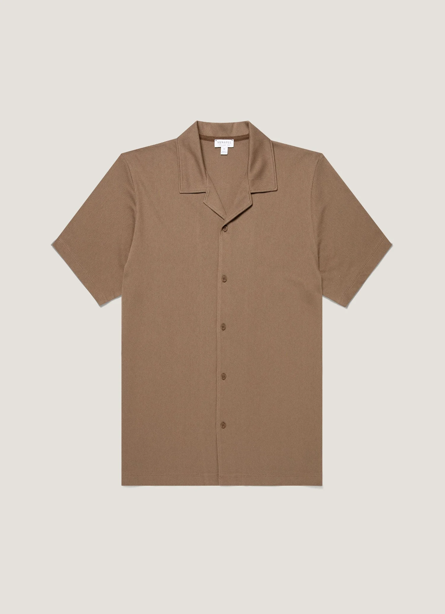 A camp collar version of the Riviera Polo Shirt which was made iconic by Daniel Craig in Casino Royale. The cool cotton mesh was designed for the heat of the French Riviera and is lightweight, breathable and very soft. Regular fit with matching buttons and a refined collar. The ultimate short-sleeve summer shirt. Product Code: MSHT2147-BRGR Fabric & Care - 100% Supima Cotton - Cotton is fully traceable and sustainably sourced from California - Cotton is extra-long staple for durability and comfort - Gentle wash at 30°C with similar colours - Do not tumble dry - Dry cleanable - Made in Portugal Size & Fit - Regular fit - Model is 6'1", chest 38" and wears a size M