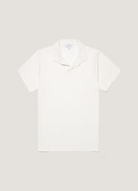 A smart, elegant polo crafted from refined Italian textured jersey, inspired by mesh fabrics in our archive. Lightweight and soft, it has a regular fit, side slits, and an open, buttonless collar. A perfect piece for holiday evenings, dressed up or down. Product Code: MPOL1074-WHCR Fabric & Care - 100% Cotton - Gentle wash at 30°C - Do not tumble dry - Dry cleanable - Made in Portugal Size & Fit - Regular fit - Model is 6'1", chest 36" and wears a size M