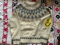 KAPITAL Fair Isle sweater, with unique knit smiley faces on the elbows. Item code: K2110KN093 100% wool Nordic pattern and a smile on the sleeve Raglan sleeve Loose fit Made In Japan Condition: Brand new with tags. Size: 3. All measurements are done by hand. I try to measure as accurately as possible, but some errors are due to occur. Shipping: They buyer is responsible for import duties and taxes. If duties and taxes are not paid and the shipment is returned, the buyer will be responsible for the shipping fees (both ways; initial shipping to the buyer and return shipping to the seller), and I will only be issuing a partial refund minus the shipping fees. For countries not listed, please message me to see if we can sort something out. FINAL SALE. NO RETURNS. NO EXCHANGES. PLEASE DO NOT TRY ANYTHING FUNNY. I WILL CONTACT LOCAL POLICE DEPARTMENTS AND AUTHORITIES AND SUE INDIVIDUALS IF SCAMS AND FRAUDS ARE SUSPECTED.