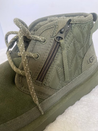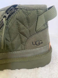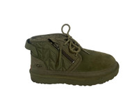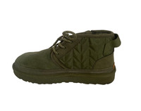 Ankle‑height UGG Neumel Zip Quilt boots in an olive green “seaweed” tone, featuring a quilted nylon side panel with chevron stitching and a functional side zipper for easy on and off. The upper combines soft suede with durable textile trim, plus a rear pull tab and tonal hiking‑style laces for a secure fit and outdoorsy look. Inside, they’re lined with plush UGG wool‑blend for warmth and comfort, set on a lightweight cushioned EVA sole that provides all‑day support and traction. These boots blend cozy slipper‑like comfort with a rugged streetwear vibe, making them great for casual cold‑weather wear