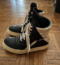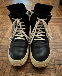 2010/2011 Short Tongue Geobaskets This pair has been heavily worn and broken in beautifully. I have polished the leather maybe 3-4 times and they still look buttery with natural patina. The soles are worn down but an easy fix for a cobbler. There is minor crackling throughout with some stains/nicks from general wear. Zippers work fine and shoes still hold their shape nicely. Tons of life left Size 40 fits 41 Feel free to ask any questions