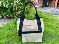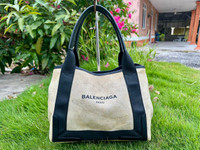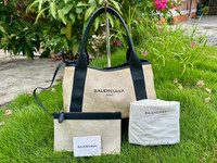 Authentic Balenciaga Navy Cabas Small in Beige Tote Bag