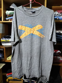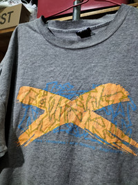 Distressed roundneck and back have holes on graphics. Thin salt. Single Stitch. Made in usa