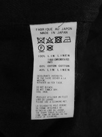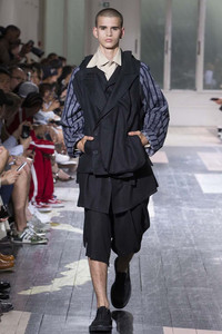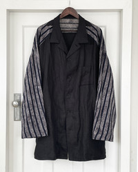 A visually striking linen jacket from Yohji Yamamoto's spring 2018 season featuring striped contrast sleeves and a loose, easy cut design for various sizes. Size 3.
