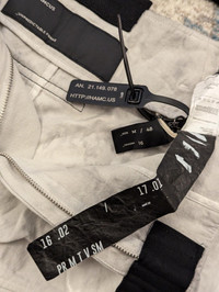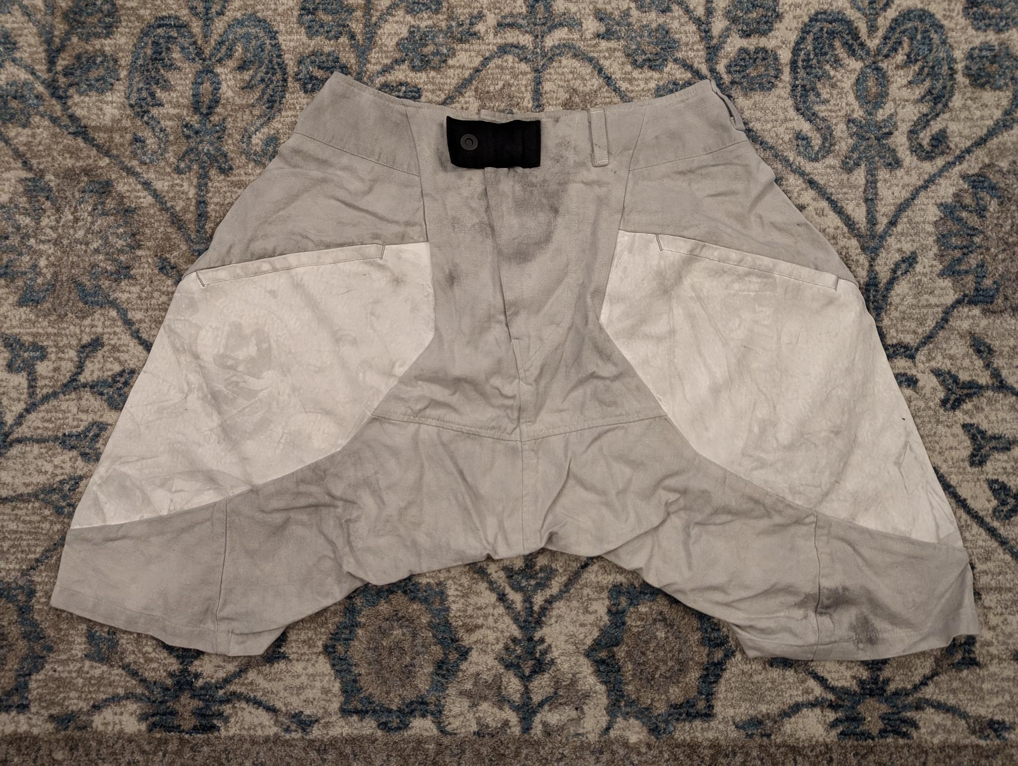 Drop-crotch Shorts In Dust White. Panelled Construction. Printed Geometric Side Panel In White. Stud Eyelet Button Fixture At Waistband. Two Pockets On Both Side And Back. Zip-fly. Tonal Stitching. Brand New, never worn, comes with PRTVMSM bag and bonus Duszen bag. From HAMCUS PRMTVSM line. Very solid piece with thick panels and tons of unique accessories grounding you in the HAMCUS universe. Wash on these ones was darker than displayed on the official website and not to my taste. Would be great for Burning Man or a summer Lunarcore fit!