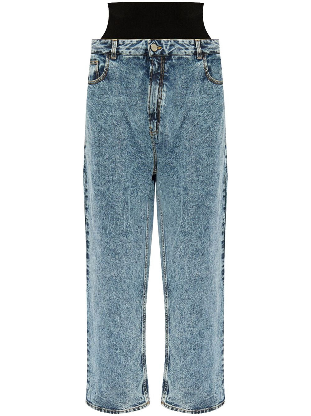 Knitted band denim jeans [ SKU: 10119673647 ] blue cotton blend classic five pockets oversize frame contrasting trim straight leg high-rise elasticated waistband Composition Cotton 99%, Viscose 48%, Polyamide 33%, Polyester 10%, Elastane 9%, Polyurethane 1% Reference AA9P01556T535524 Made in Italy Size and Fit This piece fits true to size. We recommend you get your regular size Model is 1,75m / 5ft 8in wearing size 36 (FR)