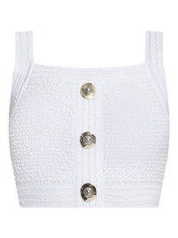 Tweed top [ SKU: 10195929905 ] white textured finish square neckline decorative button detailing wide shoulder straps Reference FF1AB052KI740FA Size and Fit This piece fits true to size. We recommend you get your regular size Model is 1,75m / 5ft 8in wearing size 36 (FR)