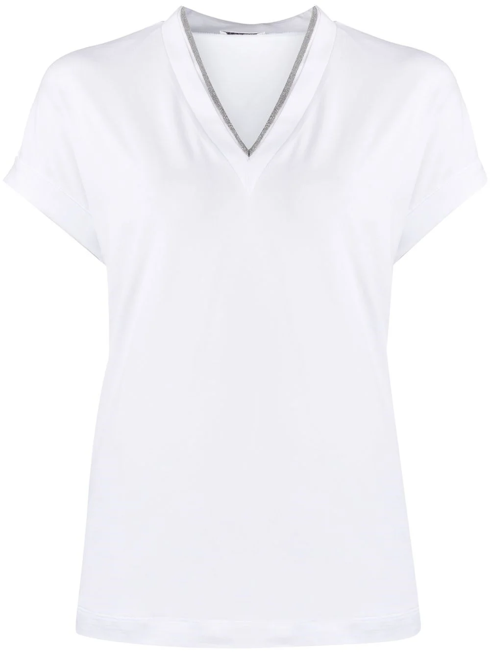 Cotton v-necked t-shirt [ SKU: 10191975291 ] white stretch cotton silvery trim V-neck short sleeves Reference M0T18BD222C159
