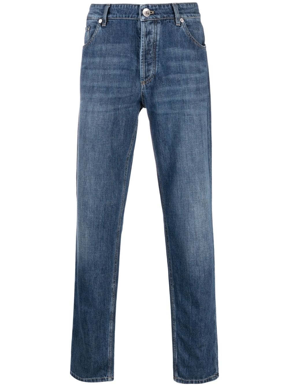 Denim cotton jeans [ SKU: 10197657252 ] blue cotton logo patch to the rear washed denim mid-rise belt loops button fly fastening classic five pockets slim cut turn-up hem Reference M0Z37D3210C1471 Made in Italy