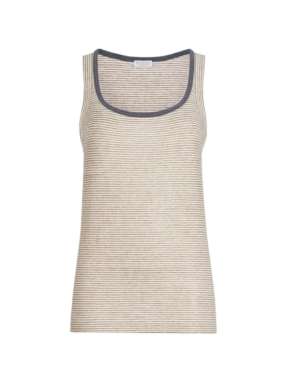 Linen tank top [ SKU: 10198743829 ] The Linen tank top by Brunello Cucinelli is a sophisticated choice for those who appreciate luxury and timeless style. This exquisite piece effortlessly complements a myriad of looks, whether layered under a tailored blazer for a business meeting or paired with high-waisted trousers for a chic evening out. Its unique design features subtle details that enhance its elegance, making it a versatile addition to any refined wardrobe. Ideal for warm weather occasions such as garden parties or casual brunches, this tank top exemplifies the intersection of comfort and style, ensuring you look effortlessly polished. Embrace sustainable luxury with this thoughtfully crafted piece, designed for the modern individual seeking quality and refinement. Reference MQ977DU530C2094 Made in Italy
