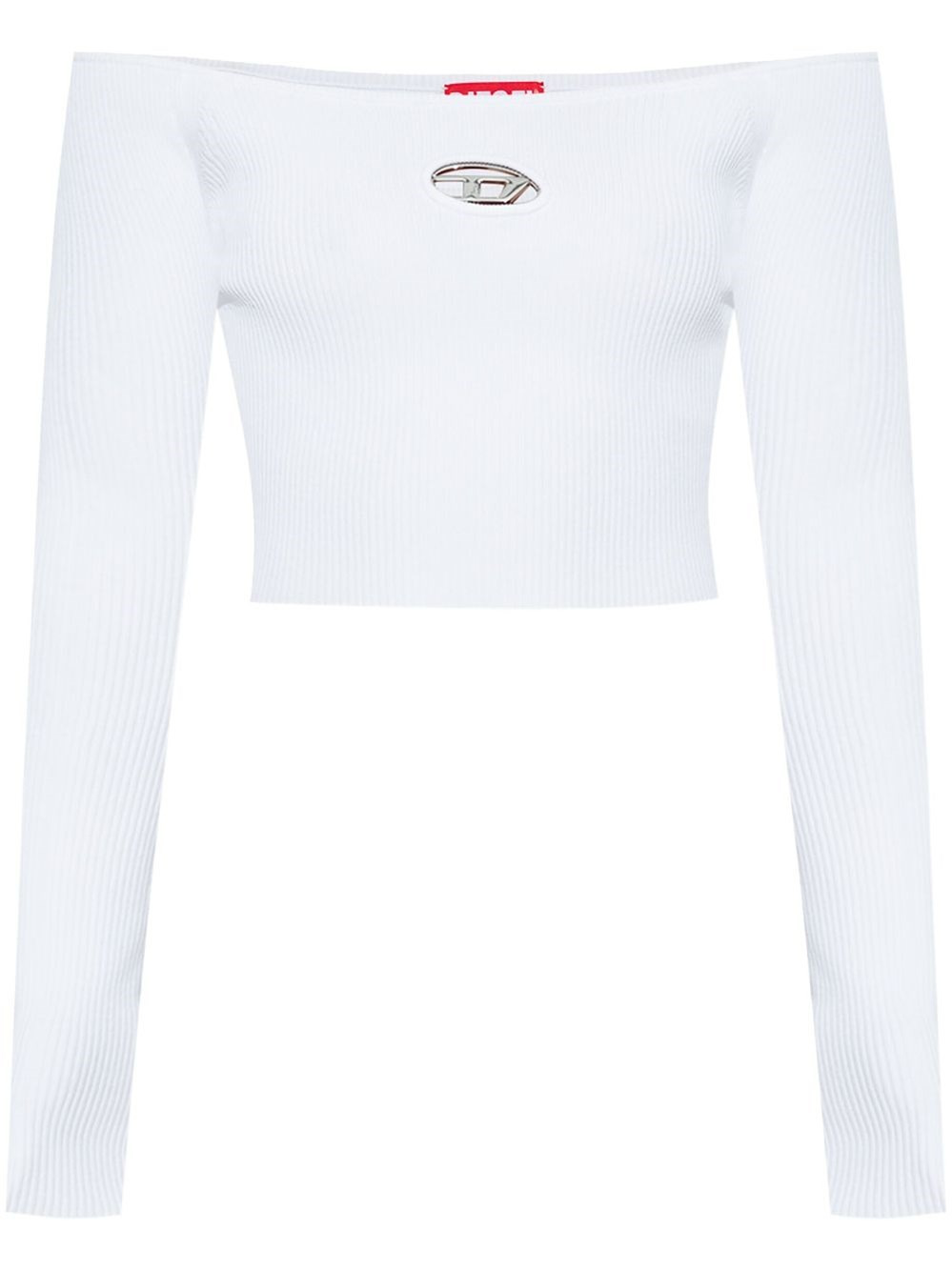 Oval-d top [ SKU: 10194531376 ] white knitted construction ribbed knit Oval D logo plaque boat neck long sleeves cropped straight hem Composition Viscose 83%, Polyester 17% Reference A141890DLAX100 Made in China Size and Fit This piece fits true to size. We recommend you get your regular size Model is 1,75m / 5ft 8in wearing size S