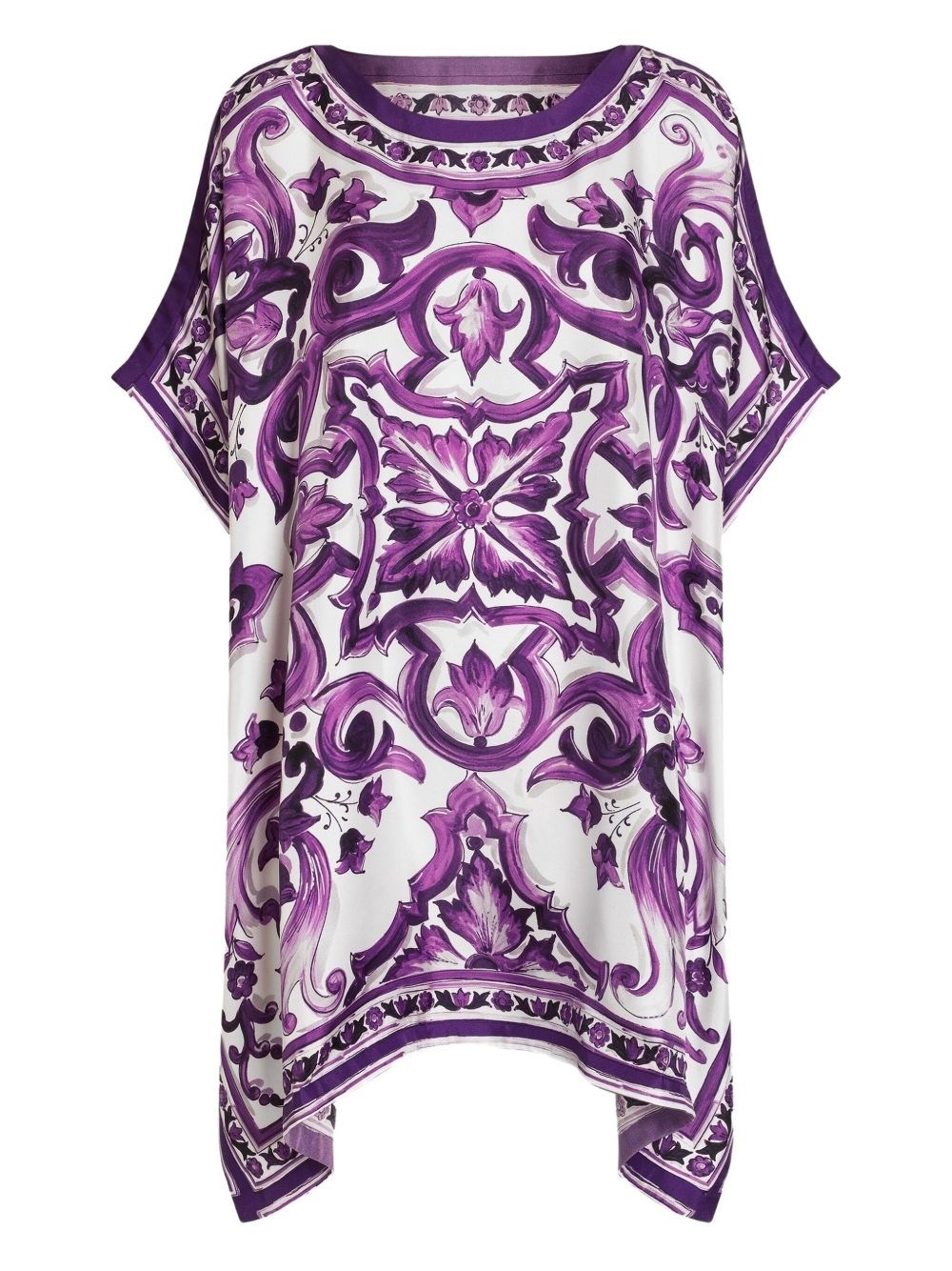 Maiolica print silk kaftan [ SKU: 10192289145 ] lavender purple round neck short sleeves flared hem thigh-length Reference F6TTETHI1TKIP3TN Made in Italy