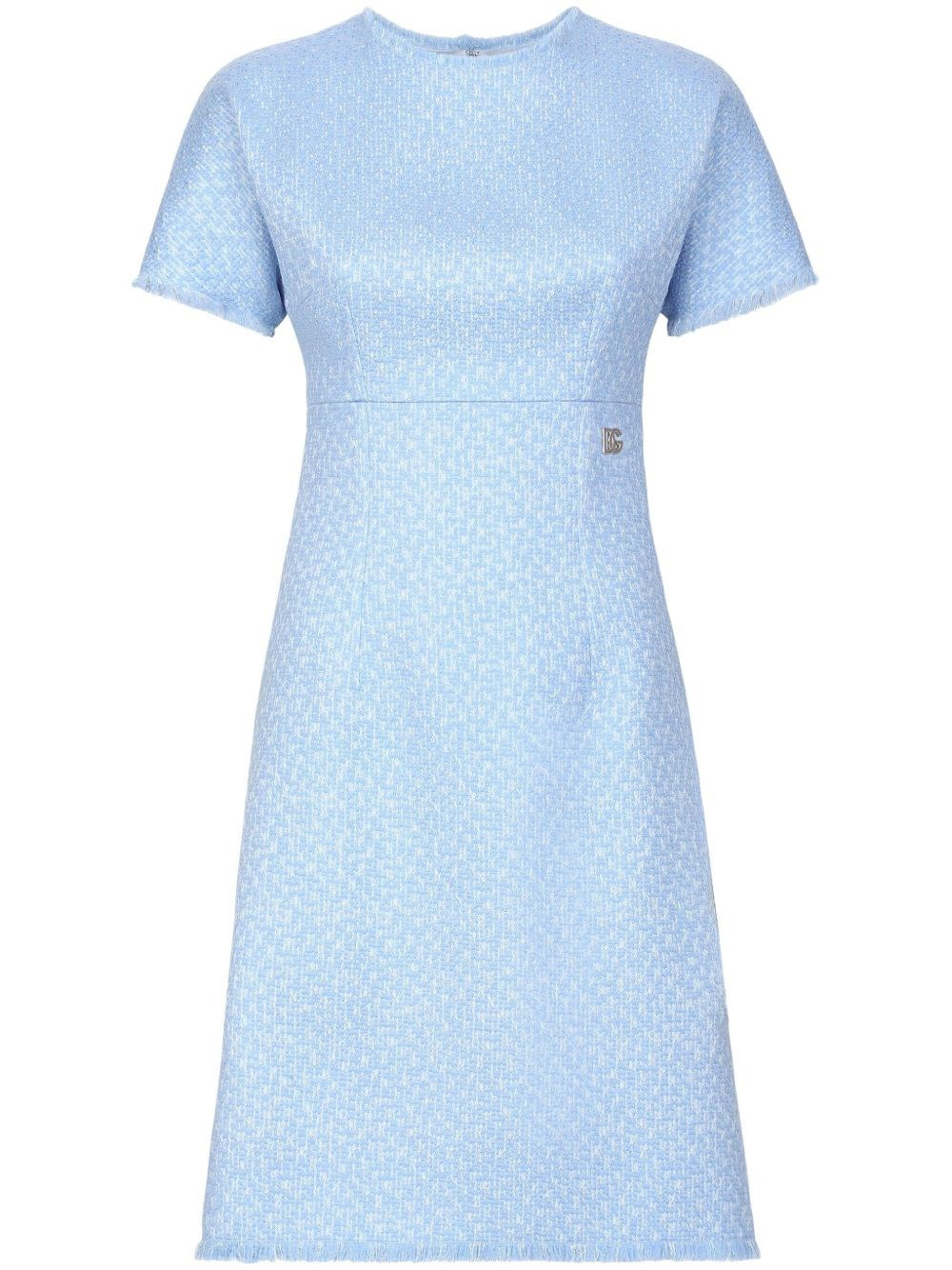 Rachel tweed dress with DG logo [ SKU: 10192998298 ] sky blue boucle construction A-line applique logo frayed edge crew neck concealed rear zip fastening short sleeves above-knee length straight hem Composition Wool or fine animal hair->Virgin Wool67.0 % Synthetic->viscose27.0 % Synthetic->Spandex/Elastane8.0 % Synthetic->Polyamide6.0 % Natural (Other)->Silk92.0 % Reference F6ARVTGDCL1F3981