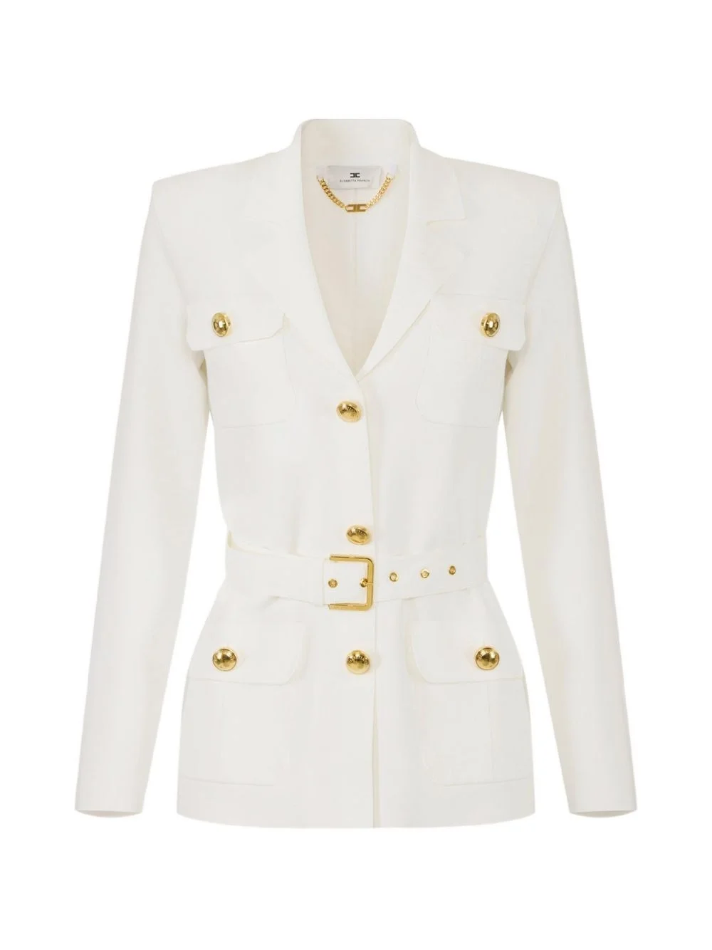 Belted single-breasted jacket [ SKU: 10196259814 ] Elevate your wardrobe with the Belted single-breasted jacket by Elisabetta Franchi. This sophisticated piece features a refined button fastening and flap pockets, complemented by a detachable belt for a versatile silhouette. The gold-tone hardware adds a touch of luxury, making it an ideal choice for both professional settings and elegant evenings. Pair it with tailored trousers and sleek heels for a chic ensemble that exudes confidence and style. Composition 60% Viscose 37%Poliammide 03% Elastane Reference MK10B62E2360 Made in China