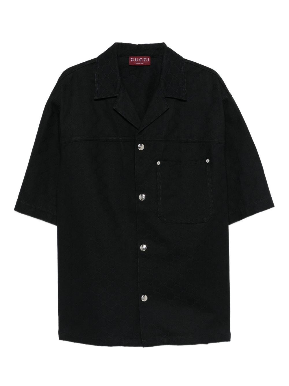 Bowling shirt [ SKU: 11455639077 ] Black GUCCI shirt featuring a front closure with contrasting metal buttons, a left pocket, short sleeves, and a classic collar. Composition 100% FABRIC Reference 832581XDDCG1000 Made in Italy