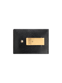 Leather cardholder with logo [ SKU: 11450581438 ] black leather grained texture signature Double G gold-tone logo lettering rectangle shape gold-tone hardware logo-engraved money clip card slots This piece comes complete with a protective dust bag. Composition 100% CALF SKIN Reference 436022DJ20T1000 Made in Italy Size and Fit LENGTH: 10.0 Centimetres WIDTH: 7.0 Centimetres