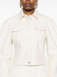 La Veste De-Nimes denim jacket [ SKU: 10192192794 ] off-white denim button fastening classic collar long sleeves flap pockets cropped Reference JAW00112AD00045110 Made in Italy Size and Fit This piece fits true to size. We recommend you get your regular size Model is 1,75m / 5ft 8in wearing size 36 (FR)