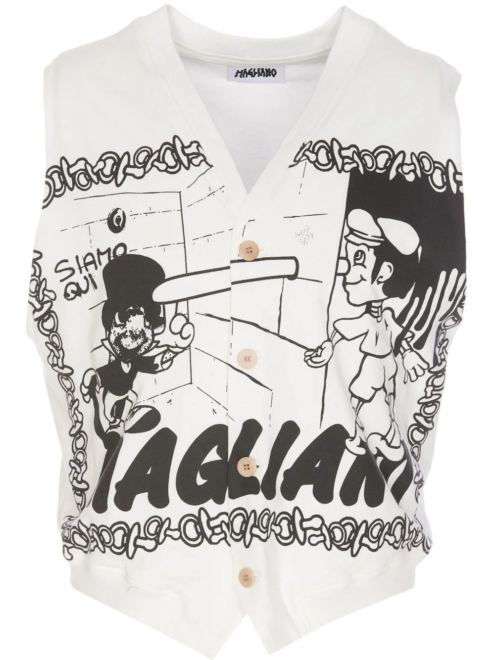 Vest Mascotte [ SKU: 11308944783 ] The Vest Mascotte by Magliano epitomizes luxury in the realm of contemporary fashion. This striking top features a unique graphic print that infuses personality into any ensemble. Ideal for layering over a fitted shirt or pairing with tailored trousers, it seamlessly transitions from casual outings to upscale events. Its sophisticated design and attention to detail make it a versatile addition to a modern wardrobe. Whether attending a gallery opening or a chic brunch, this piece enhances your style while embodying a commitment to high-quality craftsmanship. Composition 100%CO (K) Reference T2801924301 Made in Italy