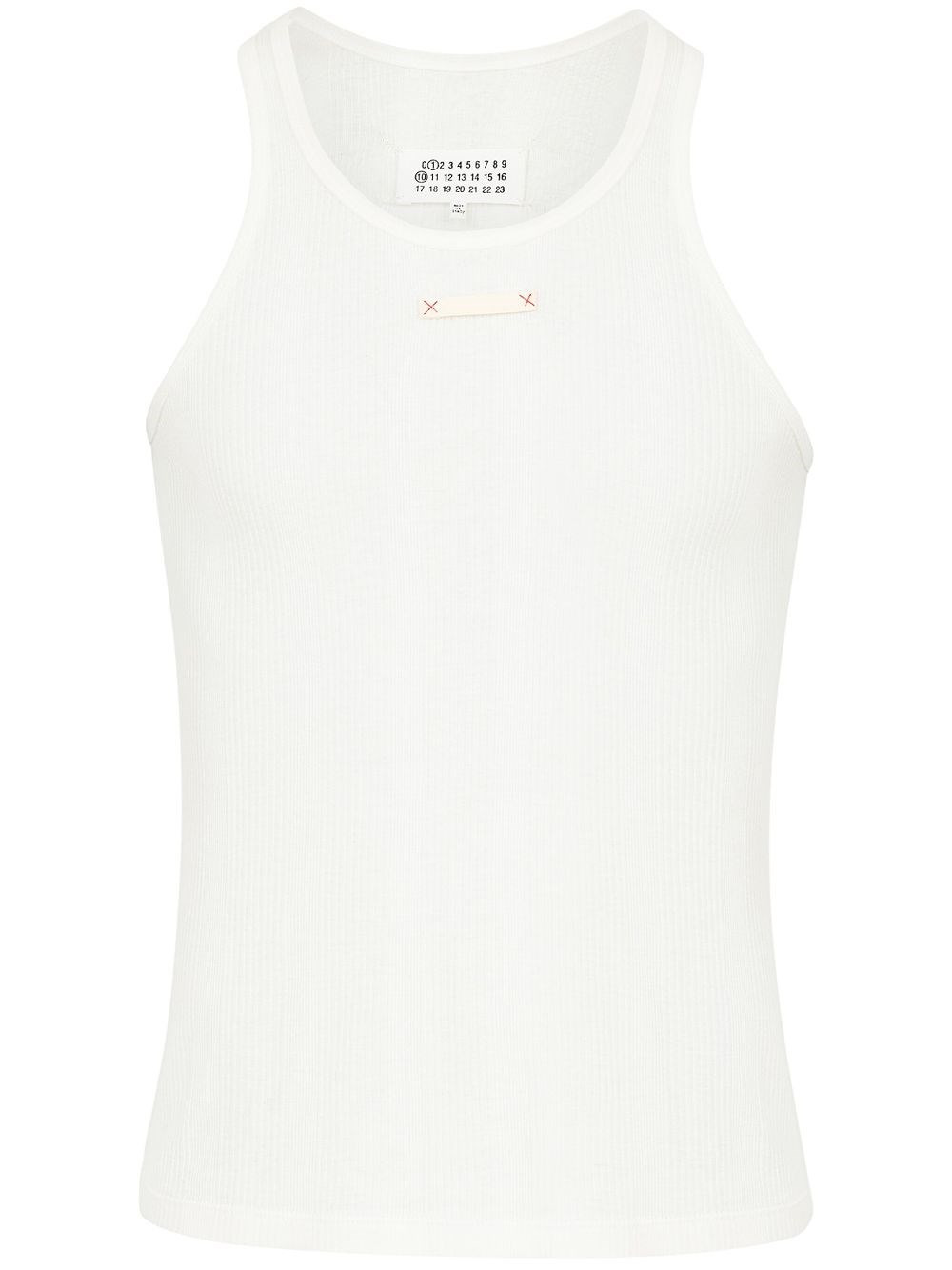 Logo cotton blend tank top [ SKU: 10192459043 ] white cotton-lyocell blend ribbed knit logo patch to the front round neck sleeveless straight hem Composition Cotton 60% Lyocell 40% Reference S50NL0049M20060101 Made in Italy Size and Fit This piece fits true to size. We recommend you get your regular size Model is 1,84m / 6ft 1in wearing size M