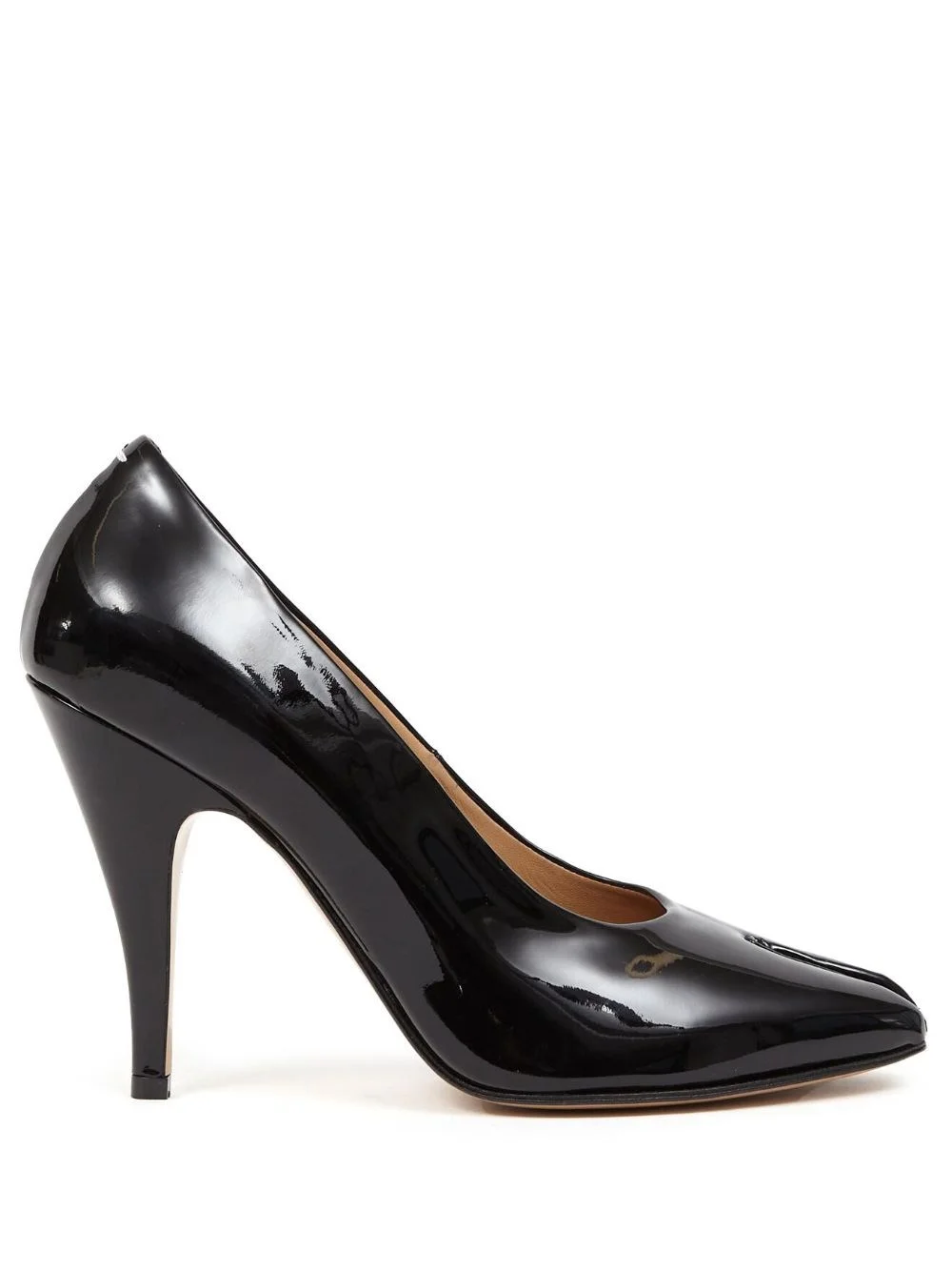 Tabi patent pumps [ SKU: 10190908911 ] black lambskin branded leather insole split toe slip-on style 110mm high cone heel Composition Sole: Calf leather 100% Exterior: Patent leather 100% Lining: Lambskin 100% Reference S39WL0131P4347T8013 Made in Italy Size and Fit Heel 4,3 in / 11 cm