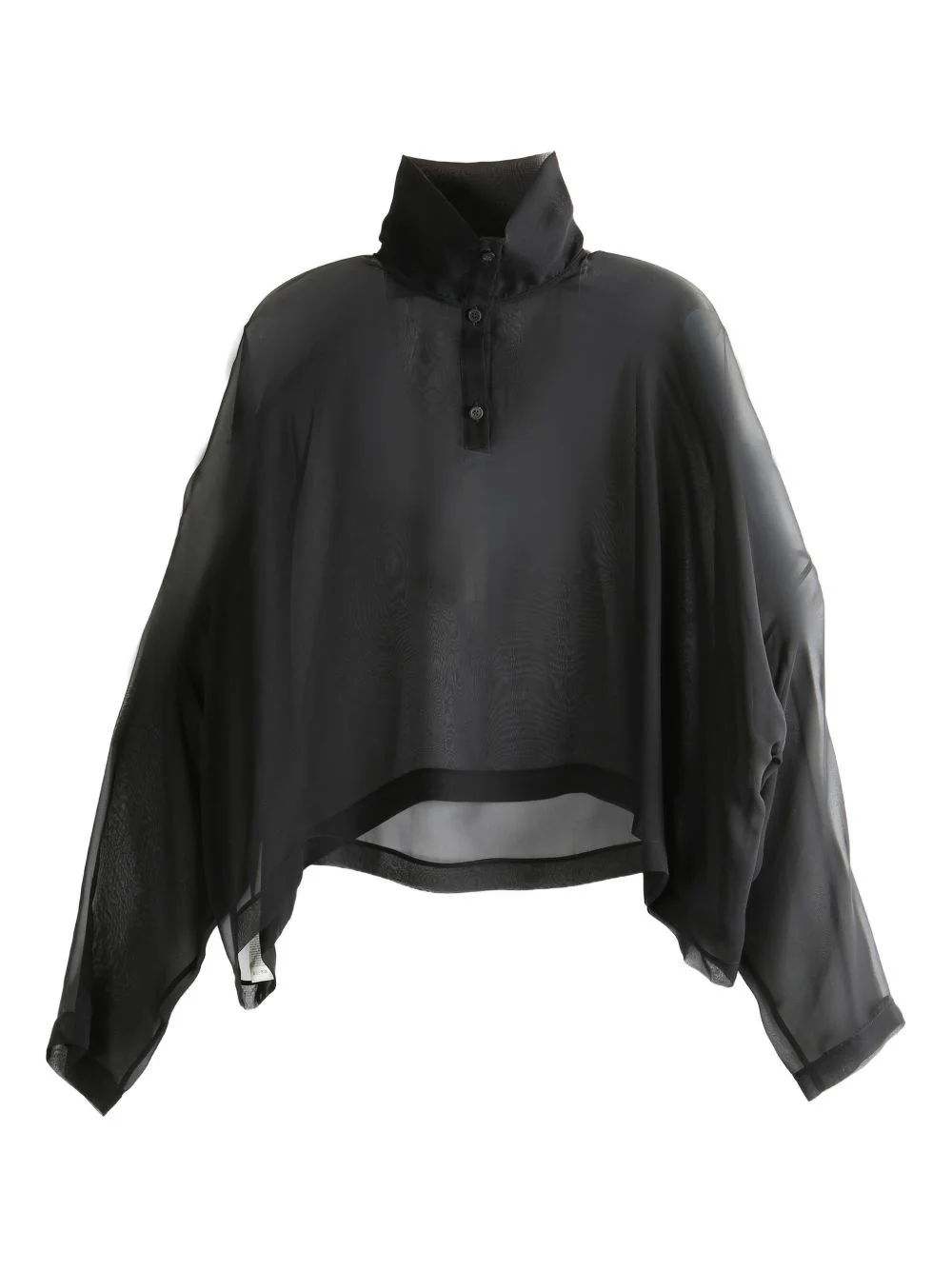 Temple Jumbo top [ SKU: 10193875520 ] The Temple Jumbo top by Rick Owens exemplifies luxury and avant-garde fashion in the realm of contemporary tops. This exquisite piece features a mock neck and a distinctive button placket, complemented by long sheer sleeves that add a touch of ethereal elegance. Perfect for an upscale evening event or a sophisticated brunch, this top offers versatility in styling, allowing for seamless pairing with tailored trousers or a flowing skirt. With its unique design and attention to detail, this top is a statement piece that elevates any wardrobe. Crafted with a commitment to quality, it reflects timeless sophistication. Reference RP01F6216S09 Made in Italy