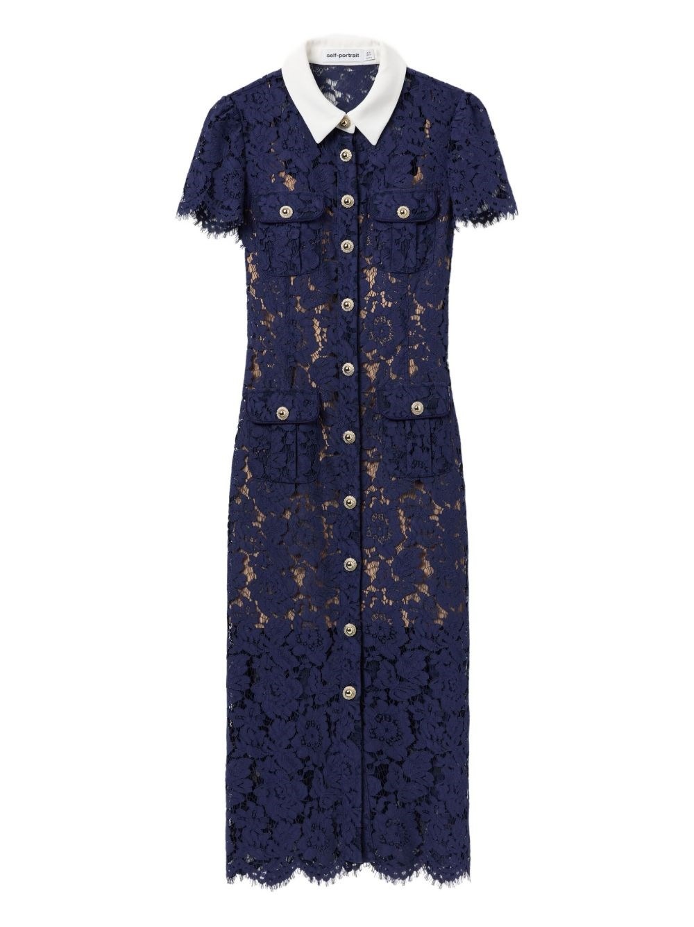 Lace long dress [ SKU: 10190775271 ] navy blue front button fastening contrasting collar four front flap pockets short sleeves Reference PF25-020MBLUE