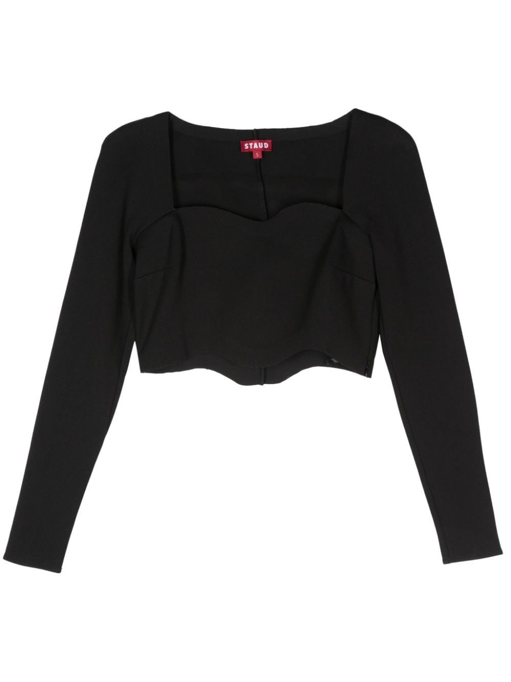 Top with logo [ SKU: 11300964600 ] black stretch-design jersey texture dart detailing sweetheart neck long sleeves concealed side hook and zip fastening cropped scallop hem unlined Reference R24P1122PTBLK Made in China