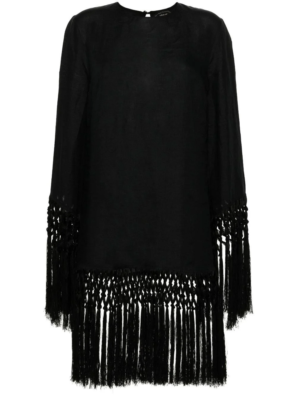 Murray linen short dress [ SKU: 10118768722 ] black linen/flax shift style round neck long sleeves fringed edge fringed hem keyhole detail to the rear unlined single rear button fastening This item contains at least 50% materials which are certified or widely recognised as having a lower environmental impact through production and/or manufacturing processes that reduce water consumption and the use of harmful chemicals, or re-use by-products of the production process. Learn more about what makes a product Conscious on our Conscious Criteria page Composition Linen/Flax 100%, Acetate 50%, Viscose 50% Reference TMPF2471133 Made in Italy Size and Fit This piece fits true to size. We recommend you get your regular size Model is 1,75m / 5ft 8in wearing size 40 (IT)