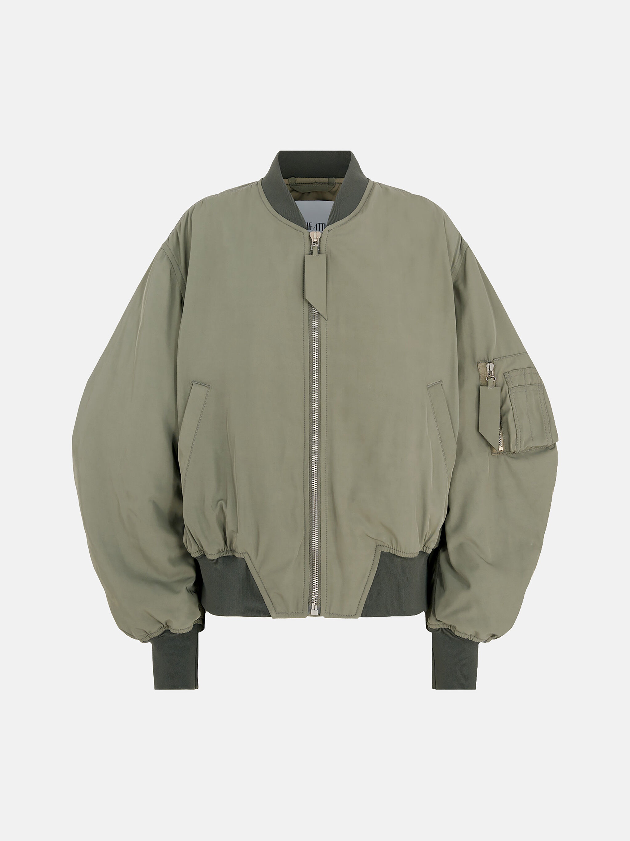 "Anja'' bomber in military green nylon with jacquard logo lining. Made in Italy. Style 250WCB00070PLL001AA828 SIZE & FIT The model is wearing a size 40 and her height is 69,6 in, bust 30,7 in, waist 23,2 in, hips 34,6 in - height 177 cm, bust 78 cm, waist 59 cm, hips 88 cm. Regular fit. We recommend taking your true size. DETAILS Main Material: 100% polyester, lining: 100% polyster, wadding: 100% polyester, rib: 100% polyamide