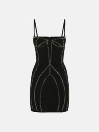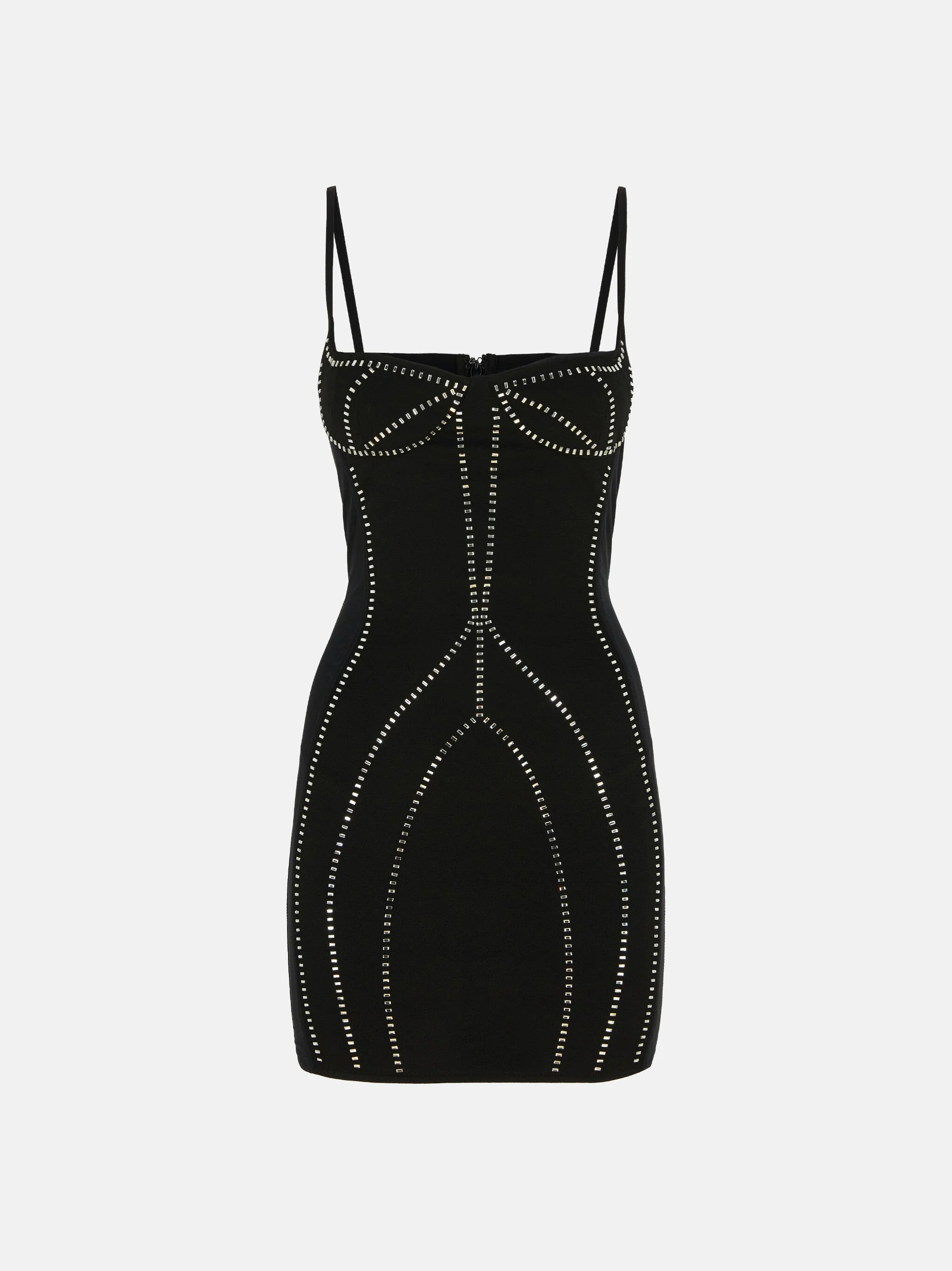 Mini dress in black thermostrass sable'' with scoop neckline. Made in Italy. Style 250WCA00401PLL002TA100 SIZE & FIT The model is wearing a size 40 and her height is 69,6 in, bust 30,7 in, waist 23,2 in, hips 34,6 in - height 177 cm, bust 78 cm, waist 59 cm, hips 88 cm. Regular fit. We recommend taking your true size. DETAILS Main Material: 69% polyamide 31% lycra, second material: 100% polyester, strass: 100% glass