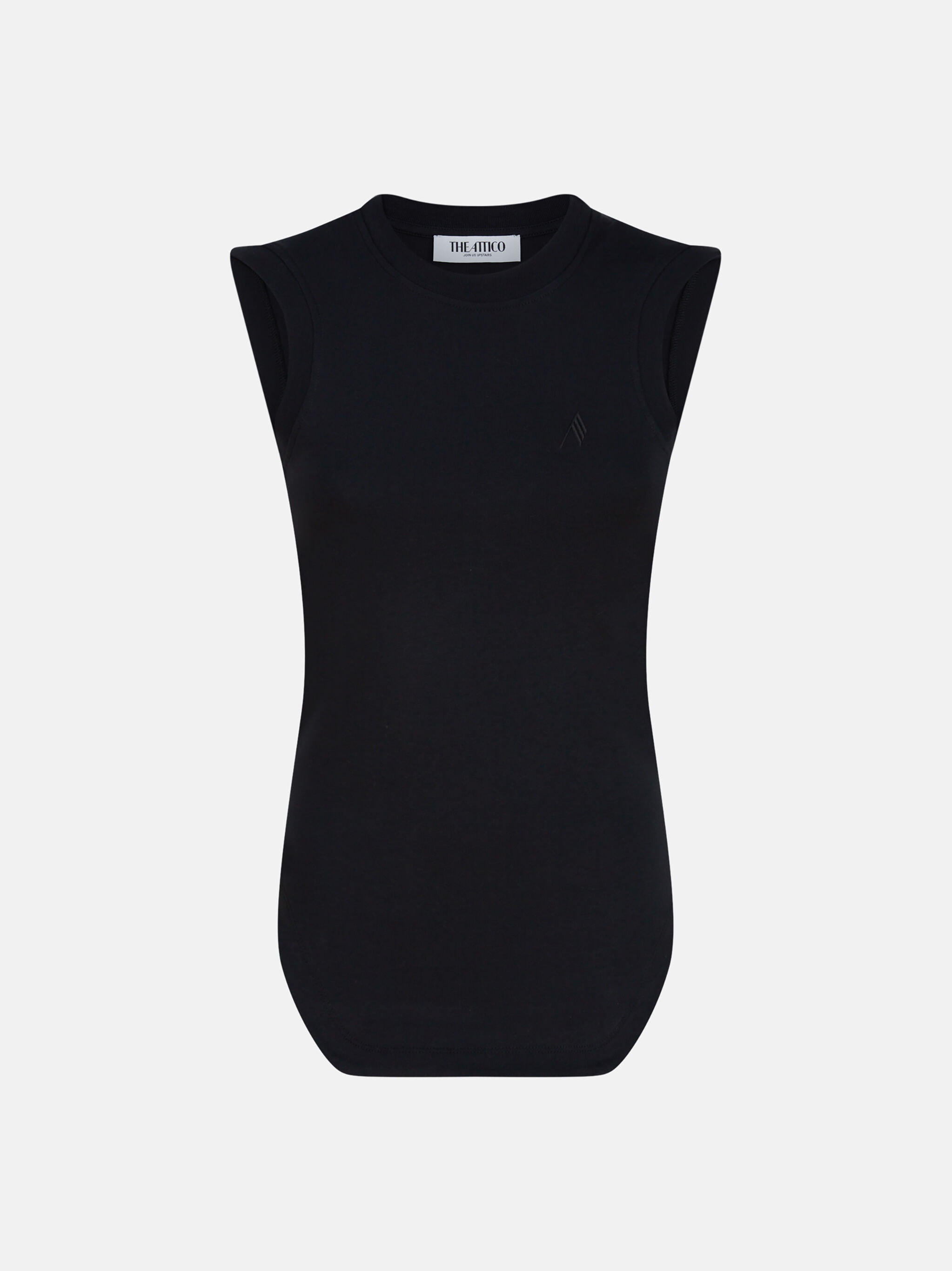 Reese'' armhole tank top in black light jersey with shaped bottom and embroidered logo. Made in Italy. Style 250WCN00003JJJ025AA100 SIZE & FIT The model is wearing a size 40 and her height is 69,6 in, bust 30,7 in, waist 23,2 in, hips 34,6 in - height 177 cm, bust 78 cm, waist 59 cm, hips 88 cm. Regular fit. We recommend taking your true size. DETAILS Main Material: 100% cotton, rib: 100% cotton