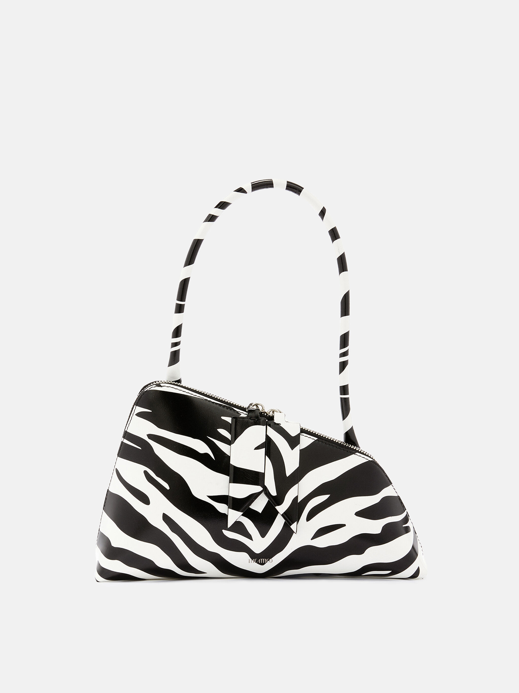 ''Sunrise'' shoulder bag in black and white zebra printed leather with shoulder strap and ziptop closure. Style 236WAH42EL020020 SIZE & FIT Height 7 inch, width 11,6 inch, depth 1,8 inch DETAILS Main Leather: 100% calf bos taurus farm raised coo: Kenya/South Africa, Lining: 51% polyurethane, 49%(70% cotton 30% polyester), Inside pocket: 100% calf bos taurus farm raised coo: Kenya/South Africa.