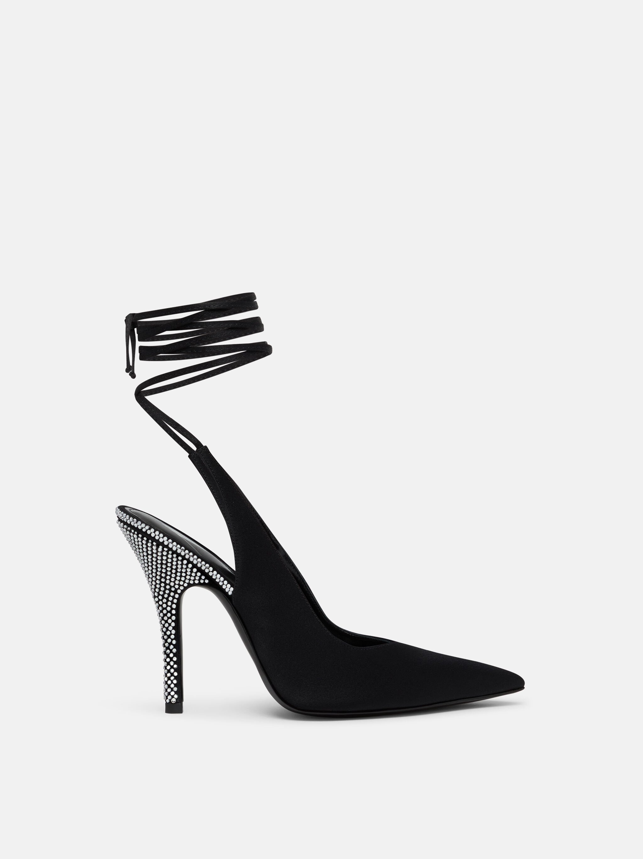 'Venus'' lace-up slingback in black satin with crystal thermoadhesives rhinestones, heel height 105mm. Made in Italy. Style 231WS032TV07212 SIZE & FIT The model is wearing a size 39. DETAILS Main fabric 80%: 100% polyester dyed - second fabric 20%: 100% strass, glass - insole and lining: 100% goat leather dyed, capra hircus farm raised coo: India - sole: 100% bovine leather dyed, bos taurus farm raised coo: France - Heel 105mm
