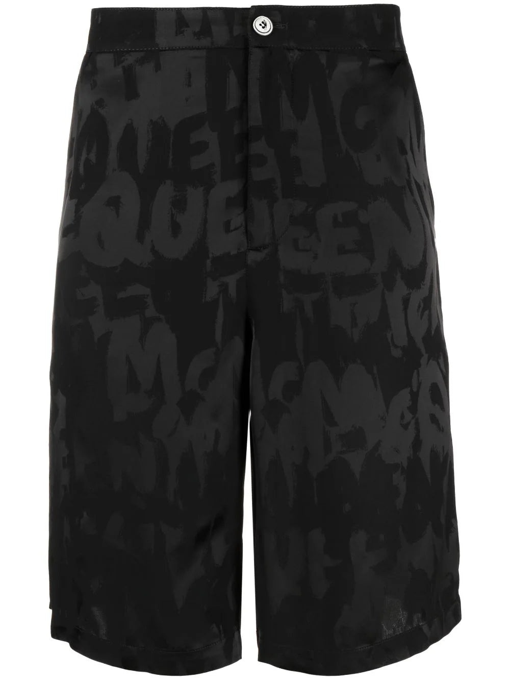 GRAFFITI LOGO-JACQUARD SHORTS FROM ALEXANDER MCQUEEN FEATURING BLACK, GRAFFITI PRINT, JACQUARD LOGO MOTIF, ELASTICATED WAISTBAND, FRONT BUTTON FASTENING, TWO REAR WELT POCKETS AND ABOVE-KNEE LENGTH.