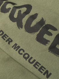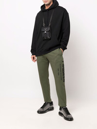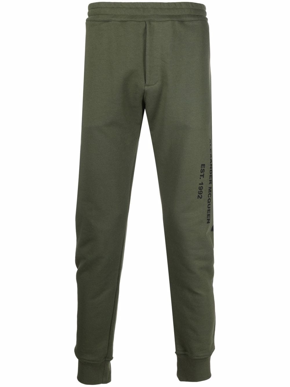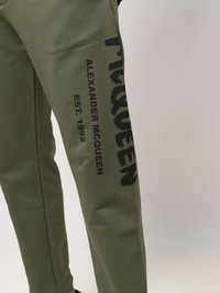 ARMY GREEN COTTON LOGO PRINT TAPERED TRACK TROUSERS FROM ALEXANDER MCQUEEN FEATURING ELASTICATED WAISTBAND, TWO SIDE SLIT POCKETS, TAPERED LEG AND REAR ZIP-FASTENING POCKET.