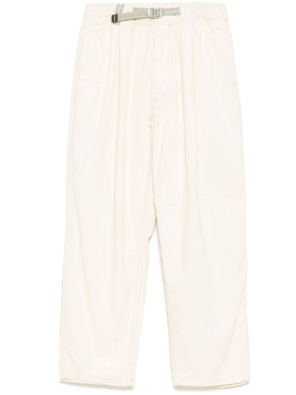 THESE CREAM WHITE CORDUROY PANTS FEATURE A FRONT ZIP FASTENING, TWO SIDE WELT POCKETS, AND TWO REAR BUTTON-FASTENING JETTED POCKETS. THE DETACHABLE AND ADJUSTABLE WAIST BELT PROVIDES A CUSTOMIZABLE FIT, MAKING THEM A VERSATILE AND COMFORTABLE ADDITION TO YOUR WARDROBE.