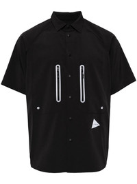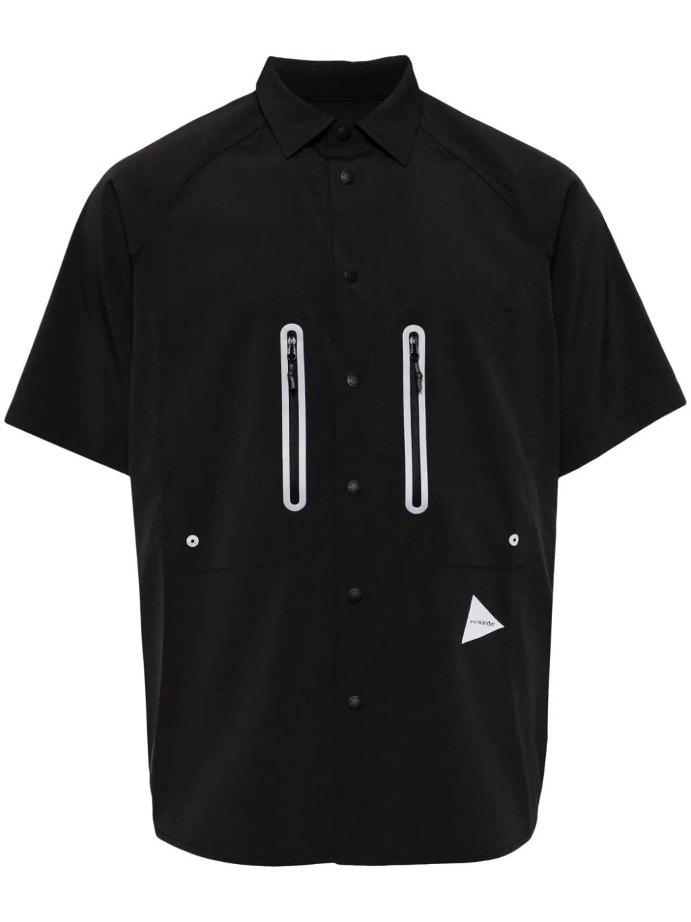 BLACK PANELLED DESIGN LOGO PRINT TO THE FRONT CONTRASTING TRIM SPREAD COLLAR FRONT PRESS-STUD FASTENING SHORT SLEEVES TWO ZIP-FASTENING CHEST POCKETS CURVED HEM