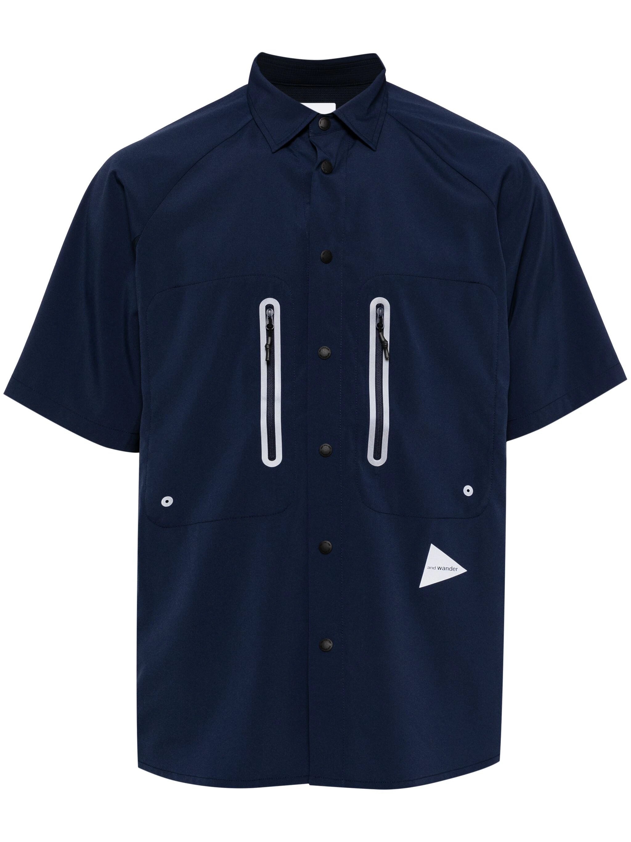 NAVY BLUE/BLACK POPLIN TEXTURE COLOUR-BLOCK PANELLED DESIGN LOGO PRINT TO THE FRONT CONTRASTING TRIM SPREAD COLLAR FRONT PRESS-STUD FASTENING SHORT SLEEVES TWO ZIP-FASTENING CHEST POCKETS CURVED HEM