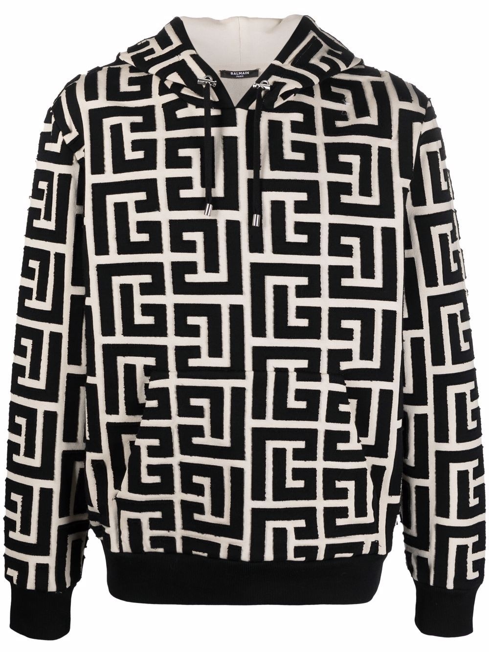 BLACK/WHITE COTTON MONOGRAM-PRINT HOODIE FROM BALMAIN FEATURING MONOGRAM PRINT, DRAWSTRING HOOD, ELASTICATED CUFFS AND ELASTICATED HEM.
