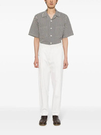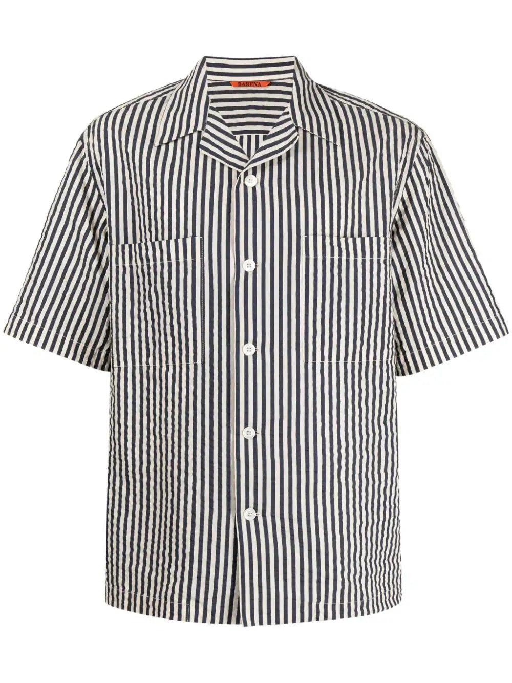 NAVY BLUE/WHITE COTTON-SILK BLEND SEERSUCKER TEXTURE VERTICAL STRIPE PATTERN NOTCHED COLLAR FRONT BUTTON FASTENING SHORT SLEEVES TWO FRONT PATCH POCKETS STRAIGHT HEM