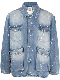 JUNGLE FATIGUE DENIM JACKET FROM BILLIONAIRE BOYS CLUB FEATURING STONEWASHED, BLUE, COTTON, PAINT SPLATTER DETAIL, CLASSIC COLLAR, FRONT BUTTON FASTENING, BUTTONED-CUFF SLEEVES, FRONT FLAP POCKETS, EMBROIDERED LOGO TO THE REAR AND STRAIGHT HEM.