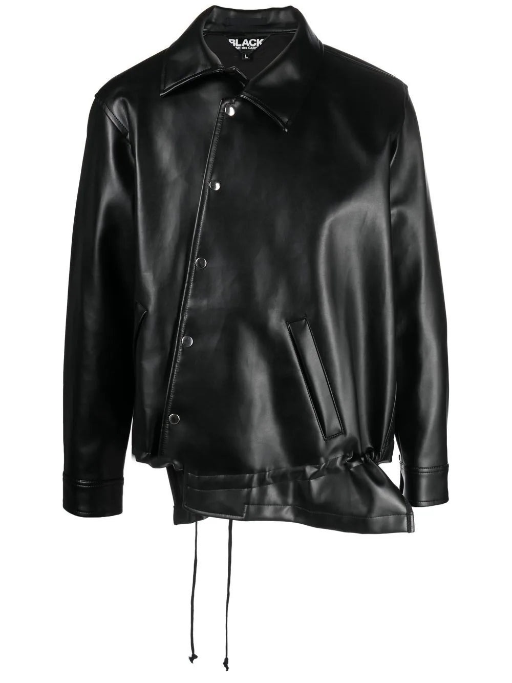 ASYMMETRIC-HEM ARTIFICIAL LEATHER JACKET FROM BLACK COMME DES GARCONS FEATURING BLACK, ARTIFICIAL LEATHER, ASYMMETRIC HEM, OFF-CENTRE FRONT BUTTON FASTENING, CLASSIC COLLAR AND LONG SLEEVES.